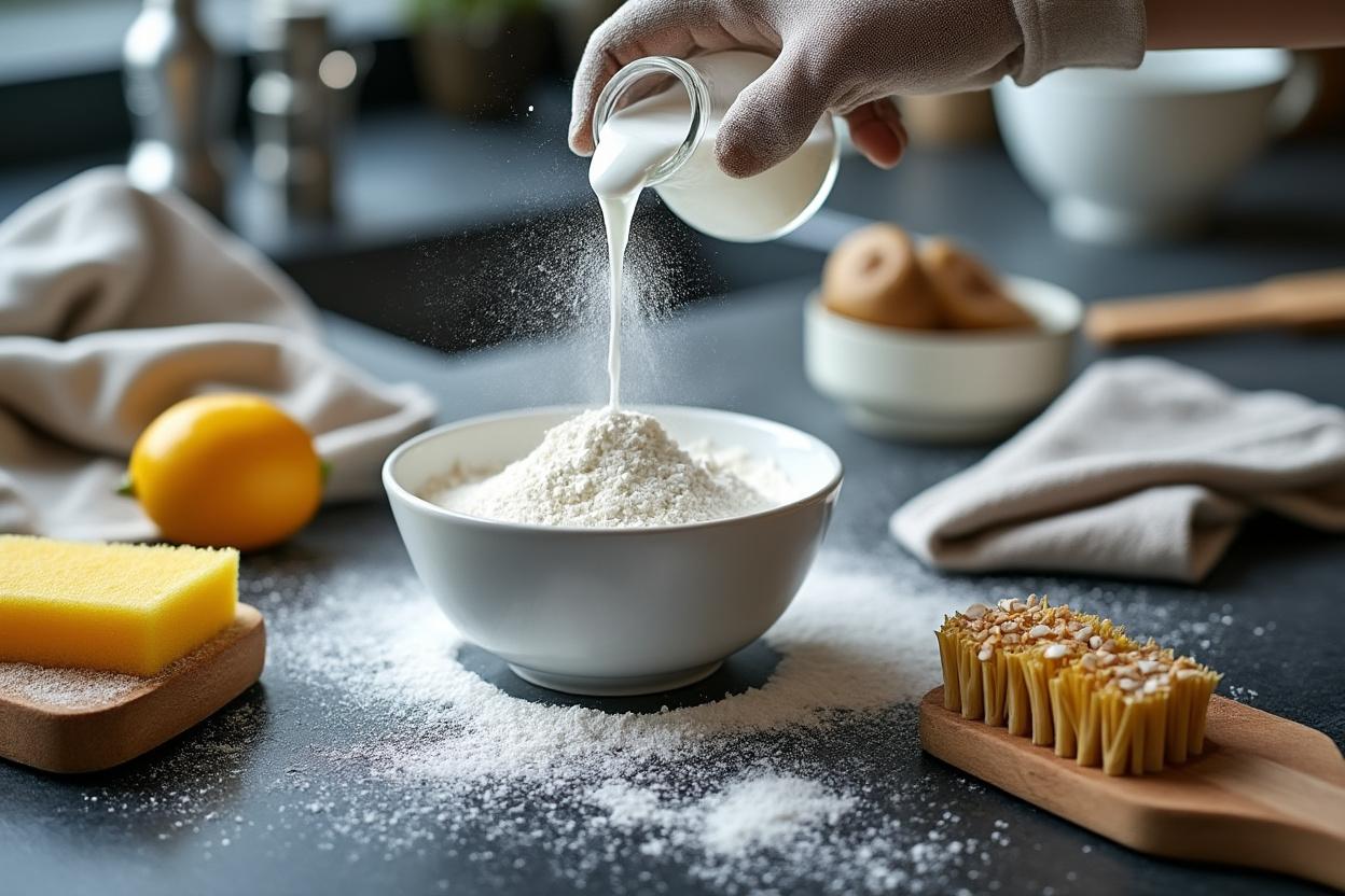 Le bicarbonate joue le rôle d’abrasif léger et d’agent neutralisant des odeurs. En pâte (bicarbonate + peu d’eau), il décolle les taches incrustées sur éviers, plans de travail, plaques de cuisson et surfaces vernies sans rayer si on frotte doucement.